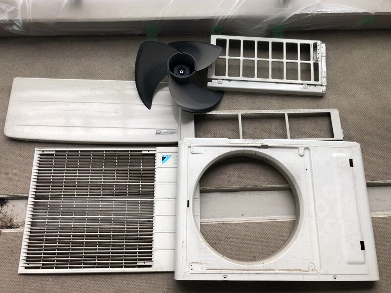 室外機はたいていのご家庭の場合、ベランダや屋外に置いてあるので雨風にさらされ汚れています。