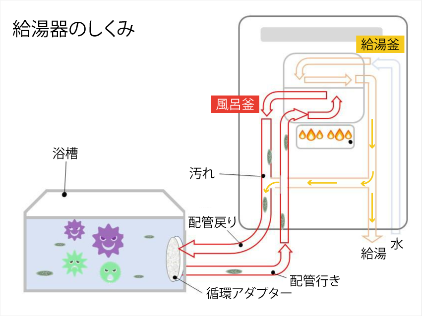 浴槽に溜まったお湯が「風呂釜配管」を通り、「風呂釜」で温められて再び浴槽に戻ってきます。