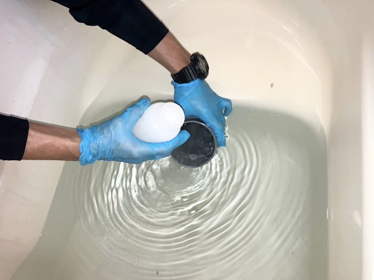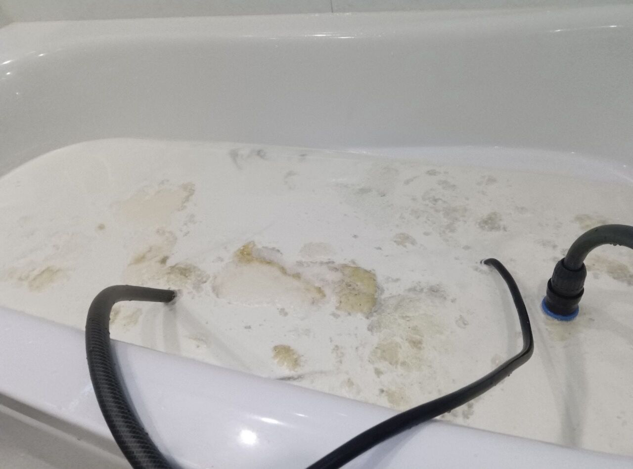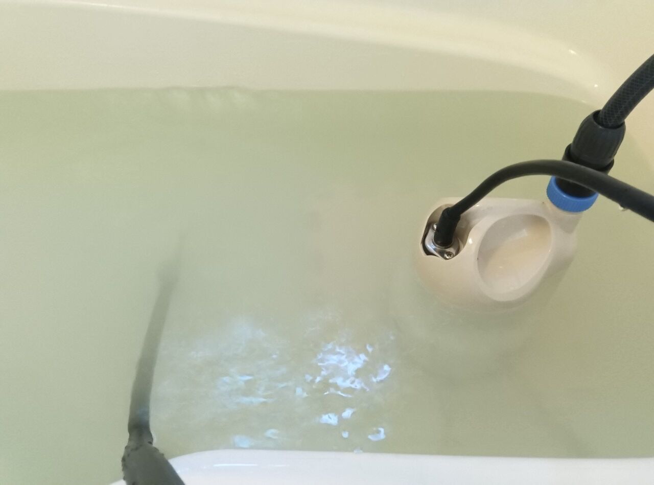 追い焚き配管用の洗浄剤と機材を使い、風呂釜配管内のレジオネラ属菌や大腸菌等の雑菌、皮脂や湯垢等の汚れを丁寧に除去します。