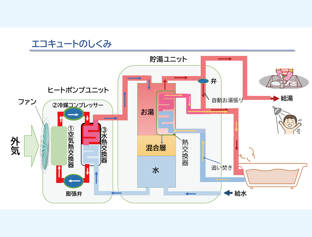 エコキュートは、電気代削減につながり、環境にもやさしい給湯器で、お湯を沸かす「ヒートポンプユニット」と、沸かしたお湯を溜めておく「貯湯タンクユニット」という2つの機器で構成されています。
