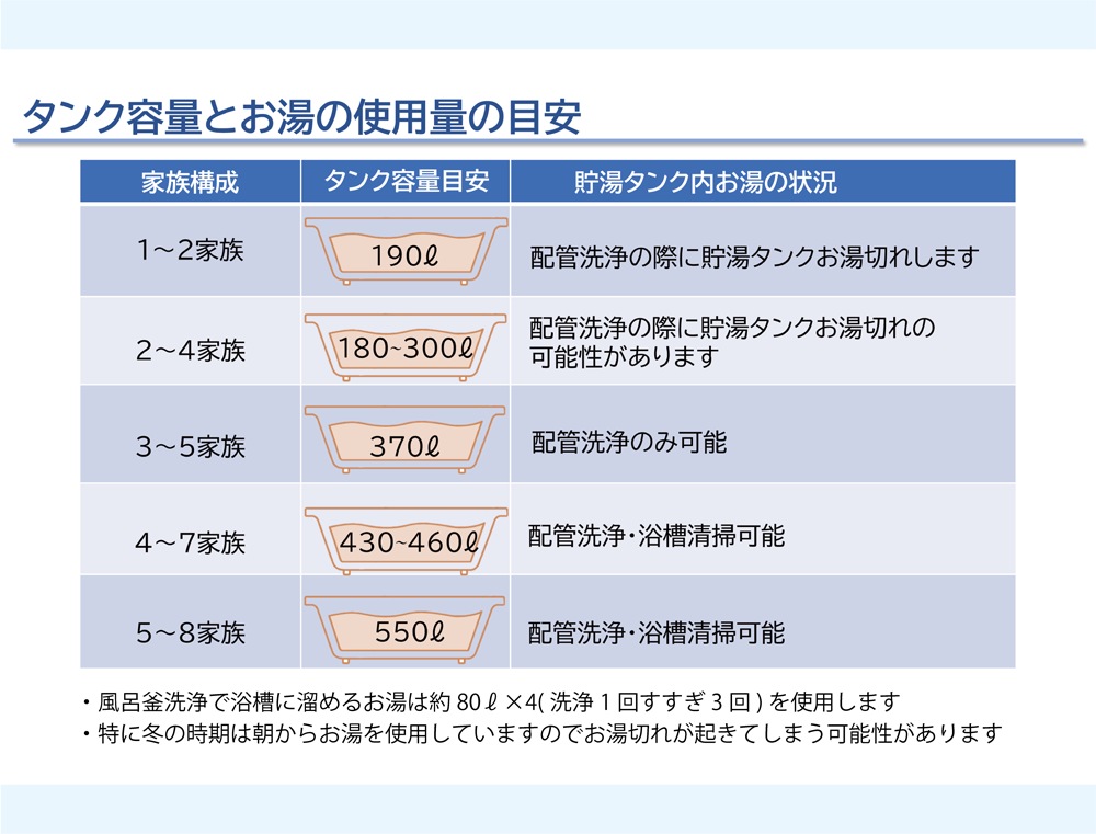 風呂釜配管洗浄にて多めのお湯を使う為、お湯切れを防ぐ機能をオンに設定しても貯湯タンクのお湯切れが起きてしまう可能性がございます。
