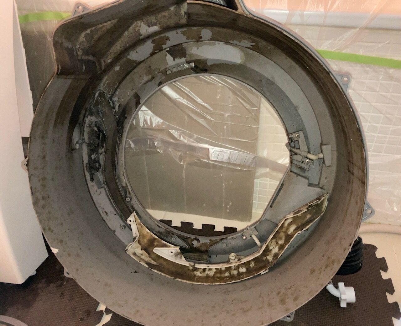写真のように洗濯槽を外すと見えない死角のカビ汚れが見えてきます。