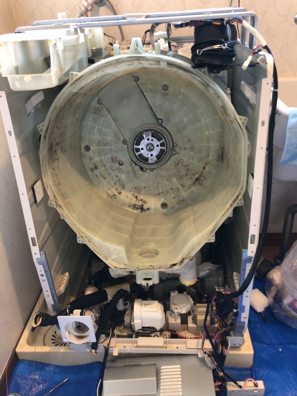 ②配線・ゴムホース・洗濯槽カバーなどを分解していきます。