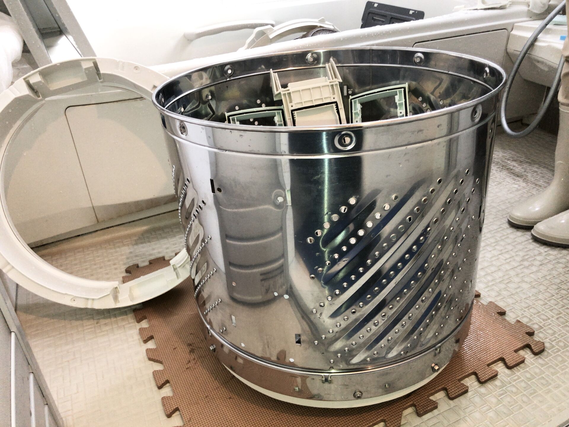 ※特に日立製洗濯機(右の写真参照)は底だけではなく、上部の蓋の部分も構造上ステンレスが食い込んでおり外せなくなっております。